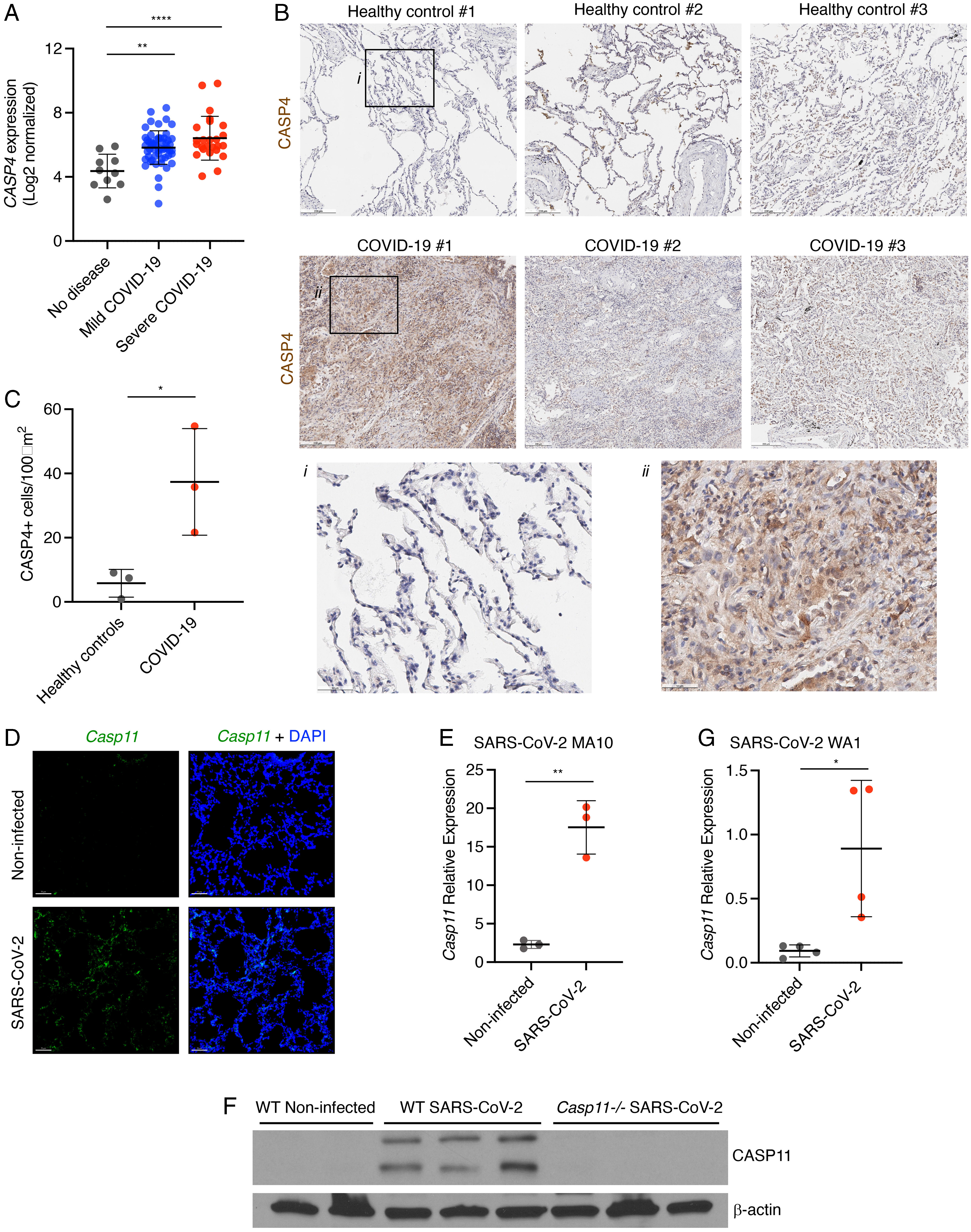 Severe acute respiratory syndrome coronavirus 2 (SARS–CoV-2) is a worldwide health concern, and new treatment strategies are needed. Targeting inflammatory innate immunity pathways holds therapeutic promise, but effective molecular targets remain elusive. Here, we show that human caspase-4 (CASP4) and its mouse homolog, caspase-11 (CASP11), are up-regulated in SARS–CoV-2 infections and that CASP4 expression correlates with severity of SARS–CoV-2 infection in humans. SARS–CoV-2–infected Casp112/2 mice were protected from severe weight loss and lung pathology, including blood vessel damage, compared to wild-type (WT) mice and mice lacking the caspase downstream effector gasdermin-D (Gsdmd2/2). Notably, viral titers were similar regardless of CASP11 knockout. Global transcriptomics of SARS–CoV-2–infected WT, Casp112/2, and Gsdmd2/2 lungs identified restrained expression of inflammatory molecules and altered neutrophil gene signatures in Casp112/2 mice. We confirmed that protein levels of inflammatory mediators interleukin (IL)-1β, IL-6, and CXCL1, as well as neutrophil functions, were reduced in Casp112/2 lungs. Additionally, Casp112/2 lungs accumulated less von Willebrand factor, a marker for endothelial damage, but expressed more Kruppel-Like Factor 2, a transcription factor that maintains vascular integrity. Overall, our results demonstrate that CASP4/11 promotes detrimental SARS–CoV-2–induced inflammation and coagulopathy, largely independently of GSDMD, identifying CASP4/11 as a promising drug target for treatment and prevention of severe COVID-19. Copyright © 2022 the Author(s).
