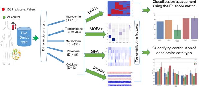 Type 2 diabetes mellitus (T2D) remains a critical health concern, particularly in its early disease stages such as prediabetes. Understanding these early stages is paramount for improving patient outcomes. Multiomics data integration tools offer promise in unraveling the underlying mechanisms of T2D. The advent of high-throughput technology and the increasing availability of multiomics data has led to the development of several statistical and network-based integration methods. However, the performance of such methods varies, requiring their output evaluation in an unbiased manner. Here, we conducted a comparative analysis of three represented unsupervised multiomics integration tools, MOFA +, GFA, and ICluster alongside an in-house supervised model EMFR, using two complementary benchmarks. First, we assessed how well the features selected by each tool could discriminate between patient and control samples using both linear and nonlinear classification models. Second, we quantified how much each type of omics data-selected features contributed to the total variance. Through such detailed comparisons between the unsupervised, we observed that the features selected by MOFA + and GFA gave the best F1 score (0.7) in the nonlinear classification model, clearly discriminating between patient and control classes. Hence, we recommend these two unsupervised integration tools for feature selection purposes. Our comparative analyses were conducted on a real biological dataset to further study prediabetes patients. Such multiomics data enabled the detection of prediabetes subtypes and provided several clinical insights that will open a new gate toward the era of personalized medicine for diabetic disease. © The Author(s), under exclusive licence to Springer-Verlag GmbH Austria, part of Springer Nature 2024.