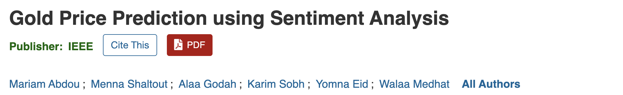 Gold is one of the valuable materials that is used for funding trading purchases. Nowadays, more investors are interested in gold investments due to the sudden increase in gold prices. However, transactions involving gold are risky, the price of gold fluctuates wildly due to the unpredictability of the gold market. Hence, there is a need for the development of gold price prediction scheme to assist and support investors, marketers, and financial institutions in making effective economic and monetary decisions. This paper analyzes the correlation between gold price movements and sentiments of Arabic tweets in Egypt. After performing sentiment analysis on these tweets, three supervised machine learning algorithms were used for predicting the gold price. The algorithms include Multiple linear regression, Ridge regression, and Lasso regression. The result of this work shows that the Lasso regression model performs better than the other two models. However, it is concluded that there is a weak correlation between gold prices and Twitter data. Therefore, gold prices cannot be accurately predicted using Twitter data alone. © 2022 IEEE.