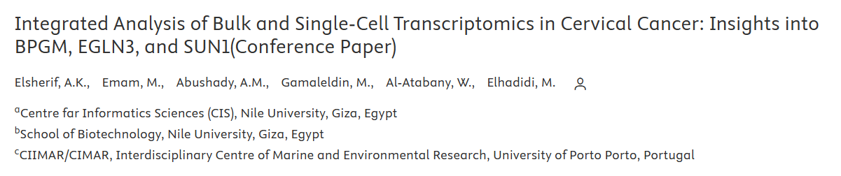 Cervical cancer (CC) is considered a significant global health threat to women therefore there is a need for personalized treatment strategy based on individual-specific gene expression patterns to enhance recovery and survival rates. Although a few studies have linked bisphosphoglycerate mutase (BPGM) expression with CC, its precise role in CC progression remains unclear. In this study, we conducted an integrated analysis for both bulk and single-cell RNA sequencing data to investigate the involvement of BPGM in CC. On the bulk RNA level, the Wilcoxon test result showed a significant upregulation of BPGM levels in CC tissue samples compared to the control samples, and particularly BPGM was found in the cancer cell subgroup within tumors on the single-cell RNA (scRNA) level. Furthermore, the survival analysis for BPGM level and its highly correlated genes indicated that, BPGM, egl-9 family hypoxia inducible factor 3 (EGLN3) as well as the Sadl and UNC84 domain containing 1 (SUM) could be predicting markers for the survival probabilities of CC patients with a significant p-value lower than 0.05. The pathway enrichment analysis for the BPGM and its correlated genes revealed various CC-related pathways such as PI3K-Akt and AMPK signalling pathways, which are very relevant for disease progression Overall; these findings suggest that BPGM and its correlated genes could serve as a potential prognostic biomarker for CC. © 2023 IEEE.