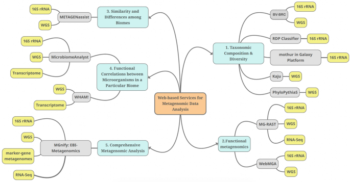 Recently, sequencing technologies have become readily available, and scientists are more motivated to conduct metagenomic research to unveil the potential of a myriad of ecosystems and biomes. Metagenomics studies the composition and functions of microbial communities and paves the way to multiple applications in medicine, industry, and ecology. Nonetheless, the immense amount of sequencing data of metagenomics research and the few user-friendly analysis tools and pipelines carry a new challenge to the data analysis. Web-based bioinformatics tools are now being developed to facilitate the analysis of complex metagenomic data without prior knowledge of any programming languages or special installation. Specialized web tools help answer researchers’ main questions on the taxonomic classification, functional capabilities, discrepancies between two ecosystems, and the probable functional correlations between the members of a specific microbial community. With an Internet connection and a few clicks, researchers can conveniently and efficiently analyze the metagenomic datasets, summarize results, and visualize key information on the composition and the functional potential of metagenomic samples under study. This chapter provides a simple guide to a few of the fundamental web-based services used for metagenomic data analyses, such as BV-BRC, RDP, MG-RAST, MicrobiomeAnalyst, METAGENassist, and MGnify. © 2023, The Author(s), under exclusive license to Springer Science+Business Media, LLC, part of Springer Nature.