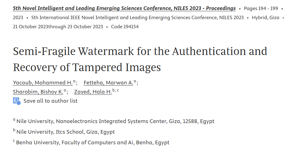 In order to strengthen the safety of corporate multimedia assets, a semi-fragile watermarking method is developed, which makes use of the integer wavelet transform (IWT) and the discrete cosine transform (DCT) for tamper detection and recovery. In this paper, we produce two distinct kinds of watermarks: an authentication watermark and a recovery watermark. A tamper detection methodology is utilized at the receiving end to check the watermarked image for validity and detect any assaults. If the changes are determined to be malicious, the suggested tamper recovery method is used to restore the altered areas of the received image. Different incidental/content-preserving modifications and malicious assaults were used to evaluate the suggested tamper detection and recovery method's performance. The suggested embedding method improved the Peak signal-to-noise ratio (PSNR) of the watermarked images as compared to existing semi-fragile watermarking methods. The suggested tamper detection and recovery method also outperformed the state-of-the-art methods by pinpointing the origin of the assaults and reclaiming the compromised components. © 2023 IEEE.