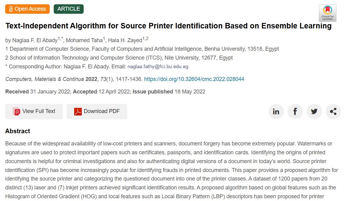 Because of the widespread availability of low-cost printers and scanners, document forgery has become extremely popular. Watermarks or signatures are used to protect important papers such as certificates, passports, and identification cards. Identifying the origins of printed documents is helpful for criminal investigations and also for authenticating digital versions of a document in today’s world. Source printer identification (SPI) has become increasingly popular for identifying frauds in printed documents. This paper provides a proposed algorithm for identifying the source printer and categorizing the questioned document into one of the printer classes. A dataset of 1200 papers from 20 distinct (13) laser and (7) inkjet printers achieved significant identification results. A proposed algorithm based on global features such as the Histogram of Oriented Gradient (HOG) and local features such as Local Binary Pattern (LBP) descriptors has been proposed for printer identification. For classification, Decision Trees (DT), k-Nearest Neighbors (k-NN), Random Forests, Aggregate bootstrapping (bagging), Adaptive-boosting (boosting), Support Vector Machine (SVM), and mixtures of these classifiers have been employed. The proposed algorithm can accurately classify the questioned documents into their appropriate printer classes. The adaptive boosting classifier attained a 96% accuracy. The proposed algorithm is compared to four recently published algorithms that used the same dataset and gives better classification accuracy. © 2022 Tech Science Press. All rights reserved.